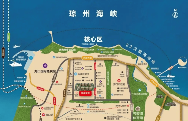 教育:约 1 公里五源河学校(九年一贯制公立),周边有五源河幼儿园、人大附中海口实验学校西海岸校区;严禁 100% 入学承诺,按当年教育局划片公告执行;