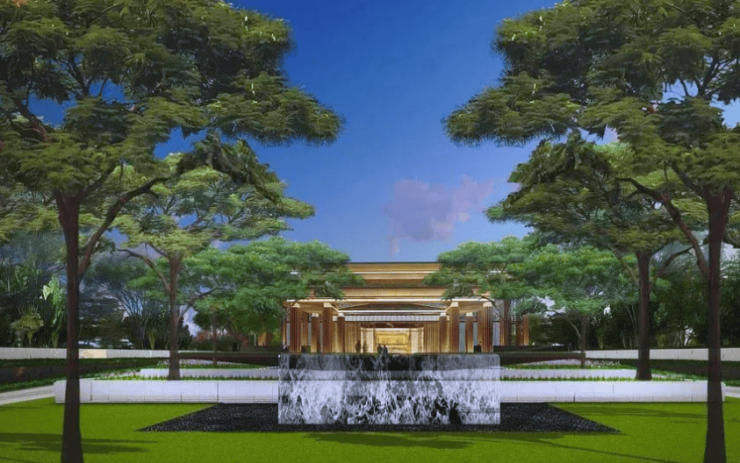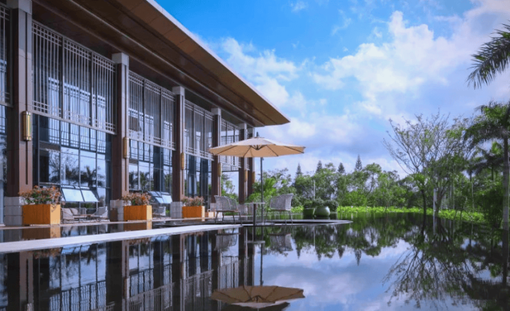 整体新中式外立面,特色坡屋顶 + 大面宽明窗,内部有风情水系、阳光草坪、花海长轴、慢跑道,热带度假感强。