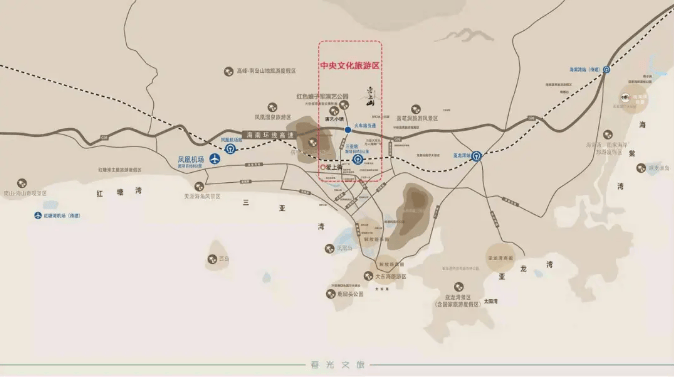 项目周边有众多热门景区,为居民提供了丰富的休闲娱乐选择。如红色娘子军演艺公园、三亚梦幻水上乐园、槟榔河温泉、槟榔河国际乡村文化旅游区、凤凰岛、鹿回头风景区、四大湾区(三亚湾、大东海、亚龙湾、海棠湾)等。此外,爱上山梦想小镇配套有约 25 万㎡丝路欢乐世界超大体量主题乐园,以十五个海南历史主题的文化背景为主题,将实景献映舞台演艺、大型游乐设施、VI 科技场馆等多元玩乐配套集于一处,打造如梦如幻的三亚映像。