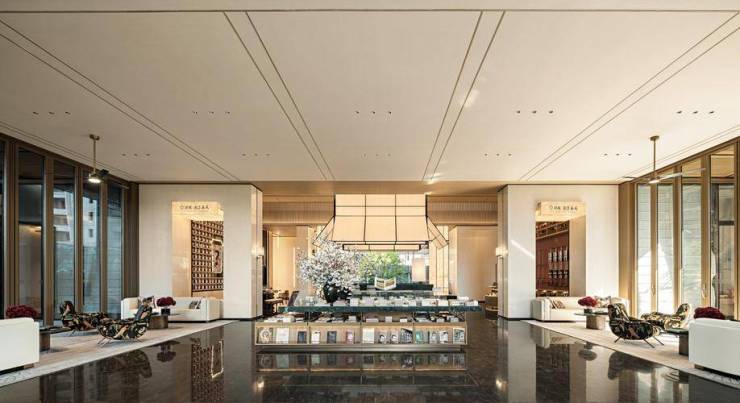 建筑设计:项目以匠心打造对称式礼仪门庭,百年铁冬青列阵相迎。精选天然奢石铺就归家路径,与刺绣纹样品牌景墙相得益彰。建筑融合了海洋文化、度假文化、咖啡文化,以现代建筑风格,凸显现代轻盈的质感和视觉时尚感。外立面强调轻盈通透、木质温润和咖色演绎,采用广阔的蓝灰色 low-e 玻璃,打造出如光幕般的立面。