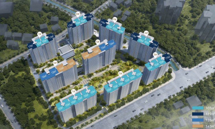 主力户型为建面约 103㎡的三房到 143㎡的四房,层高最高约 3.05m,南北通透,双景观阳台,南向多面宽,空间阔绰,格局舒适。