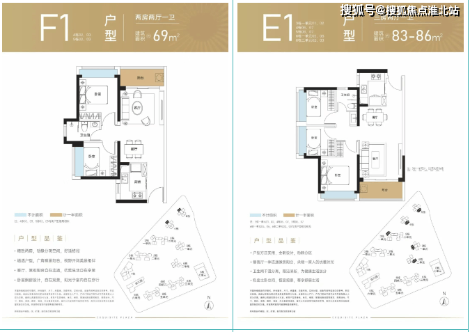 69㎡的 2 房 2 厅 1 卫:竖厅格局,客餐厅一体化,客厅 3.3 米开间,L 型厨房,得房率 72.94%,西北向看坪山河景观或东北朝向面向锦龙大道。