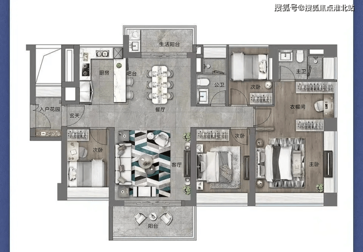 该户型采用LDKG布局,将客厅、餐厅、厨房、阳台四大公共空间融为一体,营造约11.25米长的家庭中心空间。大尺度空间可以满足家庭对生活的所有想象,无论是家庭聚会还是朋友派对,孩子活动空间也大,空间感满满。