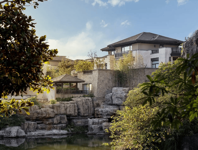 建筑风格:融合东南亚与中式建筑风格,白洞石石材立面,搭配大面积落地玻璃门窗,自然厚重又与环境融为一体。