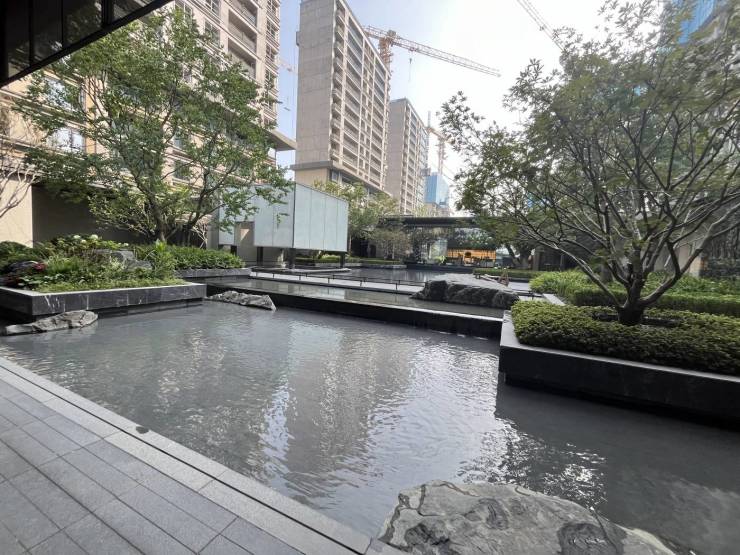 项目以 “一园三堂,意境东方” 为理念,打造五重归家礼序。从入口的景墙水院,到中央景观轴的叠石飞瀑,再到楼栋间的私密花园,每一步都浸润东方美学的诗意。园林面积达 9219㎡,借鉴倪瓒画作《江亭山色图》,以蟒水纹光影连廊串联三重水景,下沉式 “兰芷轩” 仿孔明灯造型,营造出诗意的居住环境。