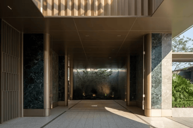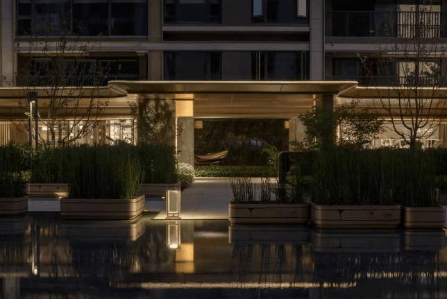 归家动线:对标高奢酒店打造环岛落客区,车库入口设有发光灯膜,地上、地下两条归家动线演绎不同仪式感。