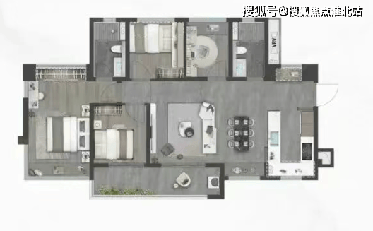 120㎡四房两厅 2 卫:横厅南北通透格局,客餐厅开间 8 米,约 14.7 米超幕视野,超长阳台,主卧转角 270° 大飘窗,U 型厨房,得房率 78.99%,阳台主朝西南或东南向。