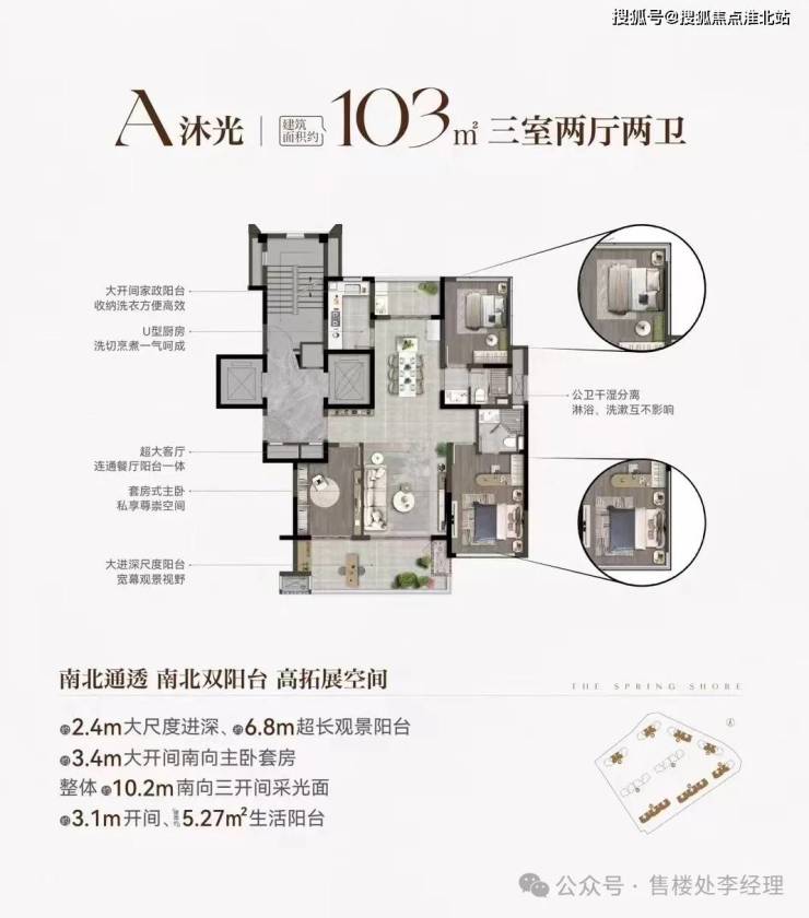 这个户型收纳洗衣便捷高效,设有大开间家政阳台。厨房洗切烹煮一气呵成,公卫干湿分离,互不影响。客厅与餐厅连通,空间开阔。套房式主卧,搭配大进深尺度阳台,拥有宽幕观景视野。南北通透,南北双阳台设计,拓展空间大。南向主卧套房开间 3.4m,还有 2.4m 大尺度进深、6.8m 超长观景阳台,整体 10.2m 南向三开间采光面,阳光满满。