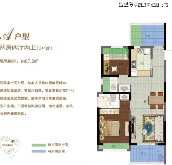 约 80-90㎡两室两厅一卫:紧凑实用户型,客厅连接南向阳台,采光较好;两个卧室面积适中,满足小家庭基本居住需求;厨房和卫生间布局合理,空间利用率高,适合刚需购房者或投资出租。