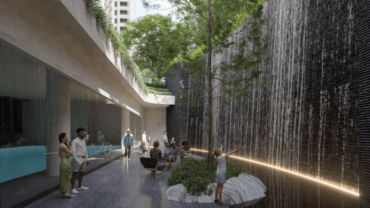建筑风格:现代新中式风格,外立面采用石材、铝板与玻璃结合,呈现沉稳、典雅的质感。