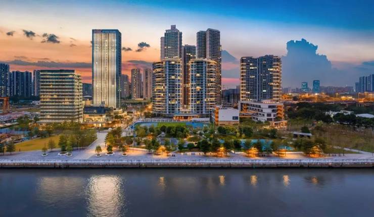 白鹅潭 2 公里连续岸线,一线南向江景稀缺,建筑后退 + 潮汐平台,亲水性强;