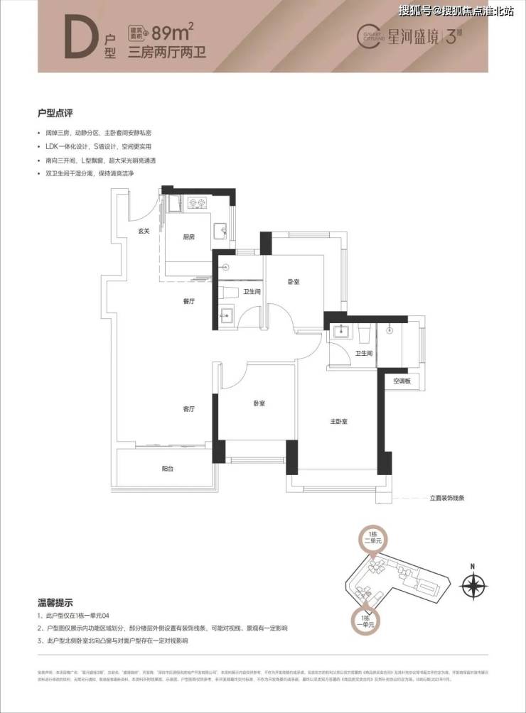 89㎡的3房2厅2卫(1栋1单元03/04户型),设计的是经典竖厅格局,创新LDK一体化餐客厅,S墙设计预留冰箱位,三开间朝南,次卧270度环幕设计,U型厨房,卫生间干湿分离,得房率80.09%(不含赠送),全部东南朝向。