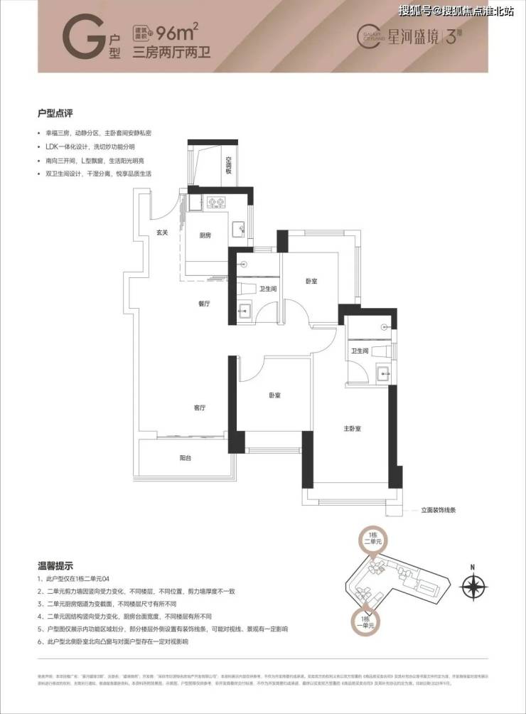 94-96㎡的3房2厅2卫(1栋2单元03/04户型),设计的是经典竖厅格局,创新LDK一体化餐客厅,S墙设计预留冰箱位,三开间朝南,次卧270度环幕设计,U型厨房,卫生间干湿分离,得房率76%(不含赠送),全部东南朝向。