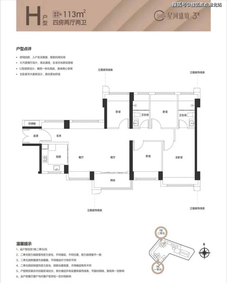 113㎡的4房2厅2卫,设计的是横厅南北通透格局,进门独立入户玄关,主卧大套房设计,三开间朝南,全屋飘窗设计,客厅采光面特别靓,得房率76%(不含赠送),阳台主朝东南向。