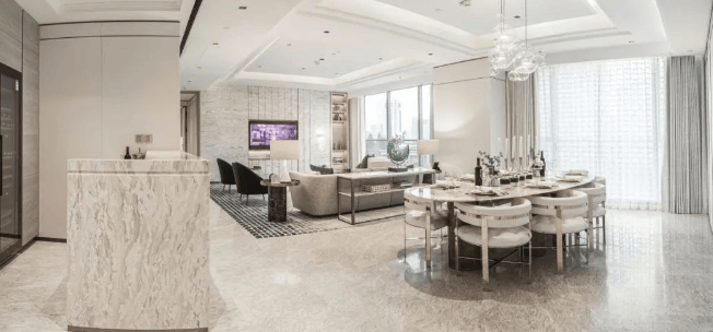 高端装修:室内装潢由多个屡获殊荣的国际级建筑师及设计师团队联袂打造,从多套房设计、宽大横厅、全景落地窗,到中西双厨加上世界级品牌的橱柜、酒柜等,从硬件到软件都充分将宽敞舒适的室内空间与现代化的装修设计融为一体。