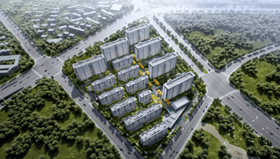 规划:项目占地面积 43,219㎡,建筑面积 98,775.4㎡,总楼栋数为 15 栋,规划户数 372 户,容积率为 2.28,绿化率 35%。