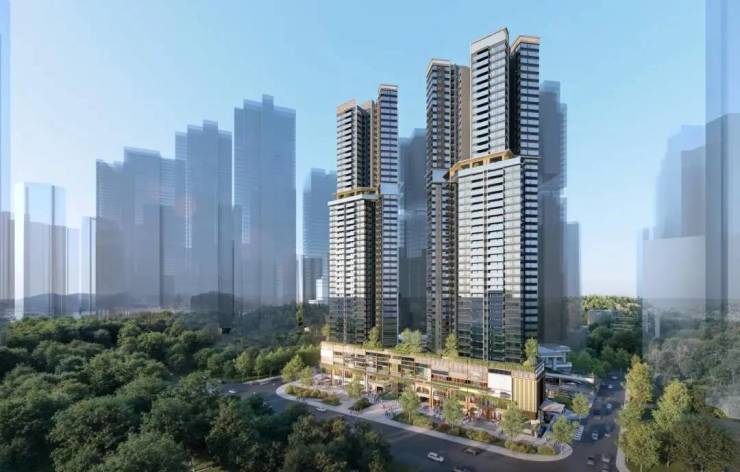 核心指标:占地约 3.2 万㎡,总建面约 16 万㎡;容积率5.0(超高层高密度),绿化率30%;共 4 栋超高层,分低区(4–28 层,两梯六户)与高区(30–44 层,两梯五户),总户数约844 户;车位配比约 1:1.2–1:1.5;社区打造立体植物园 / 空中园林 + 三层体育会所(含泳池、健身)+30 层空中会所;外立面双层 LOW-E 玻璃幕墙 + 金属线条。