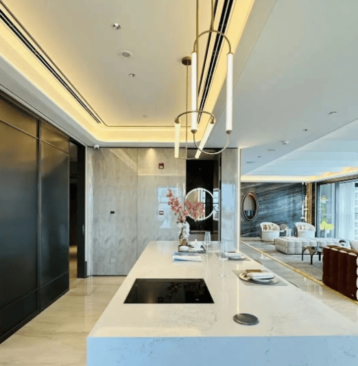 装修细节:采用国际一线品牌,如德国唯宝卫浴、瑞士劳芬浴缸、意大利Gessi水龙头等,全屋智能系统支持远程控制。