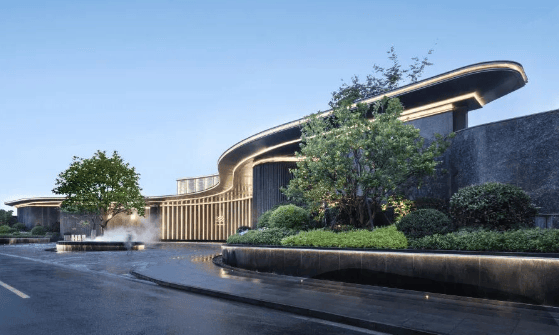 为契合周边环境,示范区建筑采⽤三角形布局,沿街⼤尺度的退让形成前场景观空间,利⽤弧形前场挑檐,弱化与街⾯形成的三⻆空间并向两边延伸,打造超⻓城市界⾯,实现酒店化落客体验,强调归家界⾯的仪式感。
