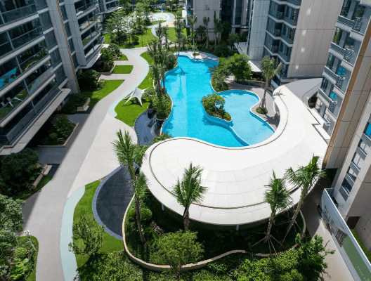 配备620㎡全龄泳池、健康跑道、架空层多功能空间(如棋牌室、健身室等),并引入万科物业提供24小时服务。