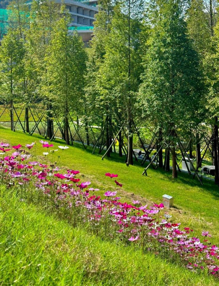 建筑设计:整体建筑立面以现代主义风格为主,建筑形体简洁、大气,以暖色调为主,辅以大面积落地玻璃和干挂石材,外立面时尚美观,与自然环境完美融合。建筑群依山迎湖自由布局,规避了建筑同质化问题。