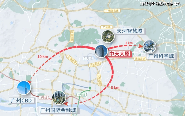 中天大厦位于天河智慧城核心,交通便利。周边2公里内连接多条高速公路,距离广州CBD约10公里车程,步行距离600米可到21号线天河智慧城站。