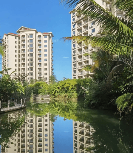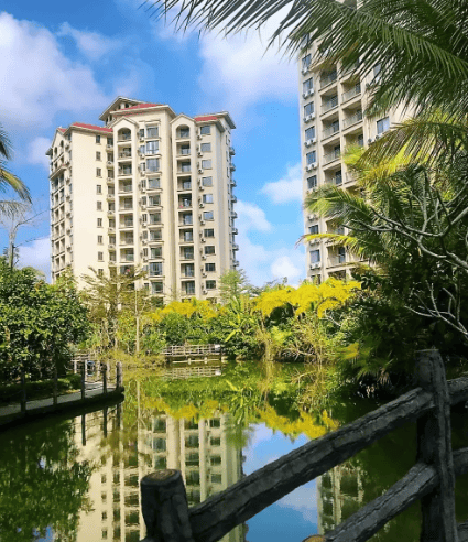 商业配套:社区内有大型中心泳池、儿童游乐场、健身广场、业主休闲区与商业街;周边步行可达第四市场、广百汇超市,日常买菜购物方便,约 10 公里可达王府井国际免税港(万宁店);