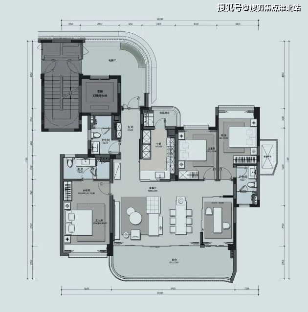 玄穹户型:建筑面积约 395㎡,五室三厅四卫。入户门厅设有玄关,主卧超大套房与其他卧室动静分区明显,约 31.5 米 “天际阳台”。