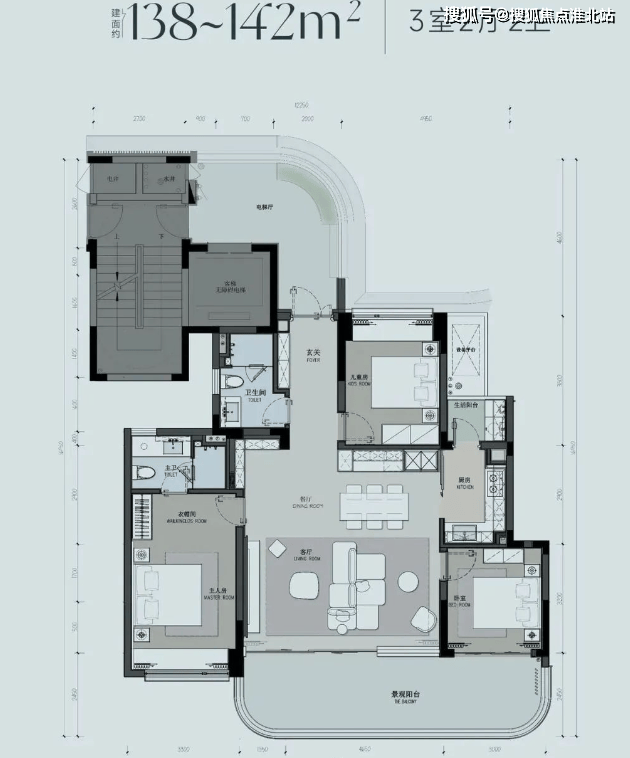 小泊户型:建筑面积约 138-142㎡,三室两厅两卫。独立入户玄关,客餐双厅格局,全南向主卧套房,朝南景观大阳台与客厅、南向次卧相连。