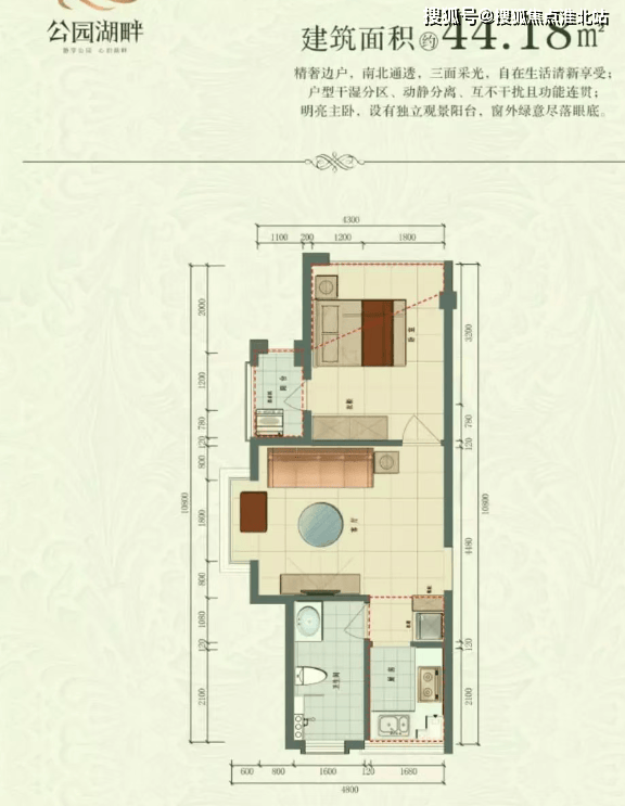 约 44.88㎡的南北通透开间:南北通透,采光通风良好,可享受充足的阳光和新鲜空气,视野开阔。