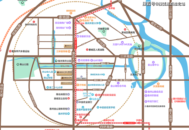 【公园】举步即达金山河绿道(全长约3.4千米)、南山公园(总体规划面积达41万平方米)及市政公园(规划中),畅享城市鲜氧森活;近享金山湖体育馆、金山湖跳水馆、惠州奥林匹克体育馆三大运动场地让生活更美好。