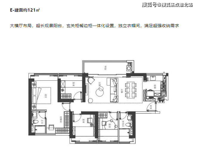 121㎡四房两厅两卫:大横厅、超长观景阳台,玄关柜与餐边柜一体化,还有独立衣帽间,满足超强收纳需求。
