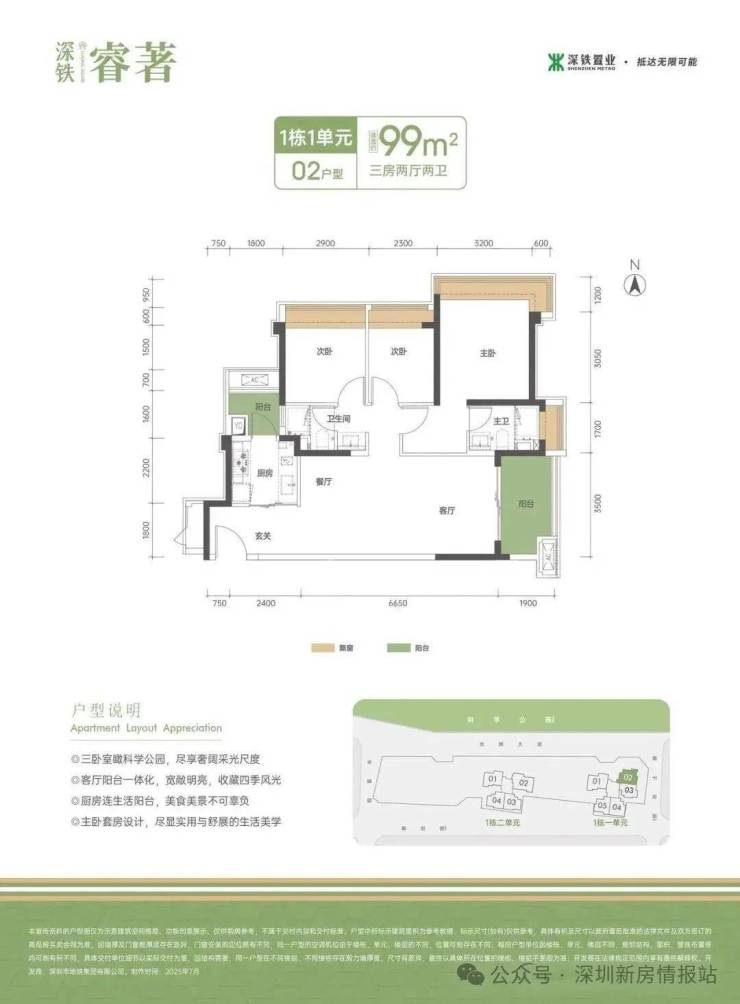 99㎡的3房2厅2卫,1栋1单元02户型,设计的是竖厅格局,客厅3.5米开间,LDKB一体化设计,进深11.7米,动静分区,三卧室朝东北向看科学公园,3个卧室分别做到了主卧18.06㎡/次卧9.57㎡/次卧7.59㎡(包含飘窗),二字型厨房还带1个生活阳台,公卫三段式分离,得房率约:80%(不含赠送),阳台6.55㎡东南朝向。套内面积79.2㎡+赠送面积12.58㎡=实用面积91.78㎡,加上赠送后得房率约92.7%。