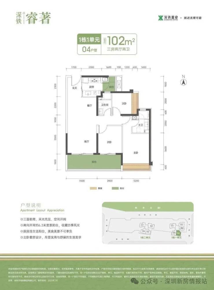 102㎡的3房2厅2卫,1栋1单元02户型,设计的是经典竖厅格局,进门入户玄关,客厅3.5米开间,LDKB一体化设计,三开间朝南,动静分区,3个卧室分别做到了主卧15.52㎡/次卧9.24㎡/次卧6.5㎡,客厅连接次卧出11.34㎡的巨幕大阳台,二字型厨房还带1个生活阳台,卫生间干湿分离,得房率约:80%(不含赠送),西南朝向。套内面积81.6㎡+赠送面积11.67㎡=实用面积93.27㎡,加上赠送后得房率约91.44%。