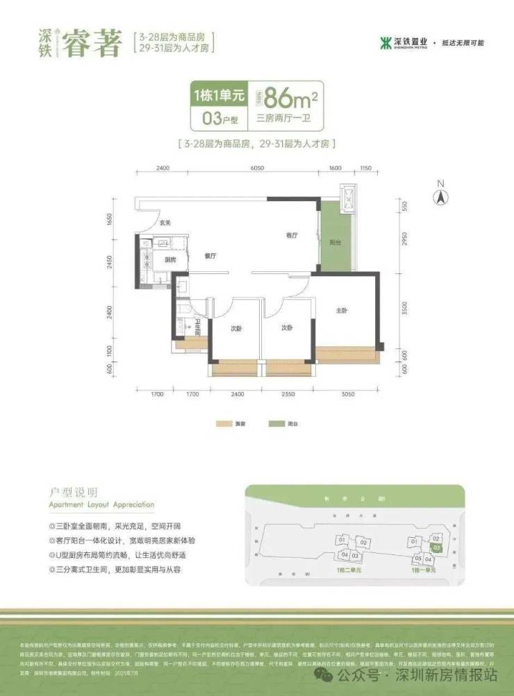 86㎡的3房2厅1卫,1栋1单元03户型,设计的是竖厅格局,客厅3.5米开间,LDKB一体化设计,进深10.05米,主卧全朝南,动静分区,3个卧室分别做到了主卧11.67㎡/次卧8.64㎡/次卧8.46㎡(包含飘窗),U型厨房,卫生间三段式分离,得房率约:80%(不含赠送),阳台5.5㎡东南朝向。套内面积68.8㎡+赠送面积8.5㎡=实用面积77.3㎡,加上赠送后得房率约89.88%。