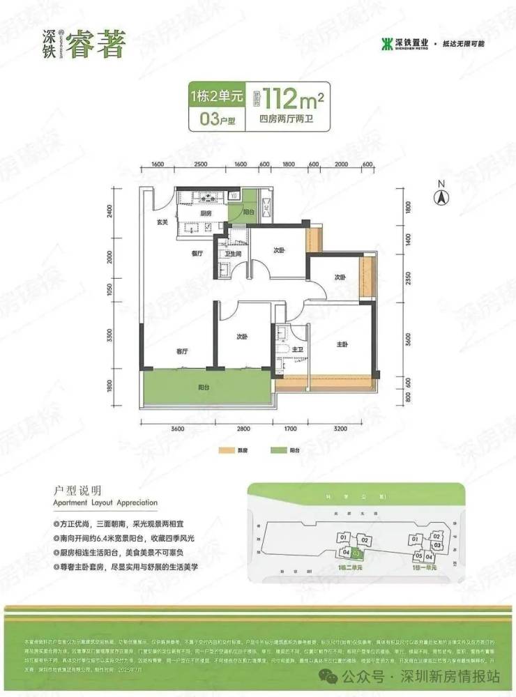 112㎡的4房2厅2卫,1栋2单元03户型,设计的是经典竖厅格局,进门入户玄关,客厅3.6米开间,餐客分离,餐厨一体设计,四开间朝南,主卧套房带阳台,4个卧室分别做到了主卧13.68㎡/次卧7.91㎡/次卧7.1㎡/次卧6.54㎡(实测面积,去掉墙体),客厅连接次卧出11.52㎡的巨幕大阳台,U型厨房,卫生间干湿分离,得房率约:80%(不含赠送),阳台主朝东北向看科学公园。套内面积89.6㎡+赠送面积13.47㎡=实用面积103.07㎡,加上赠送后得房率约92.02%。