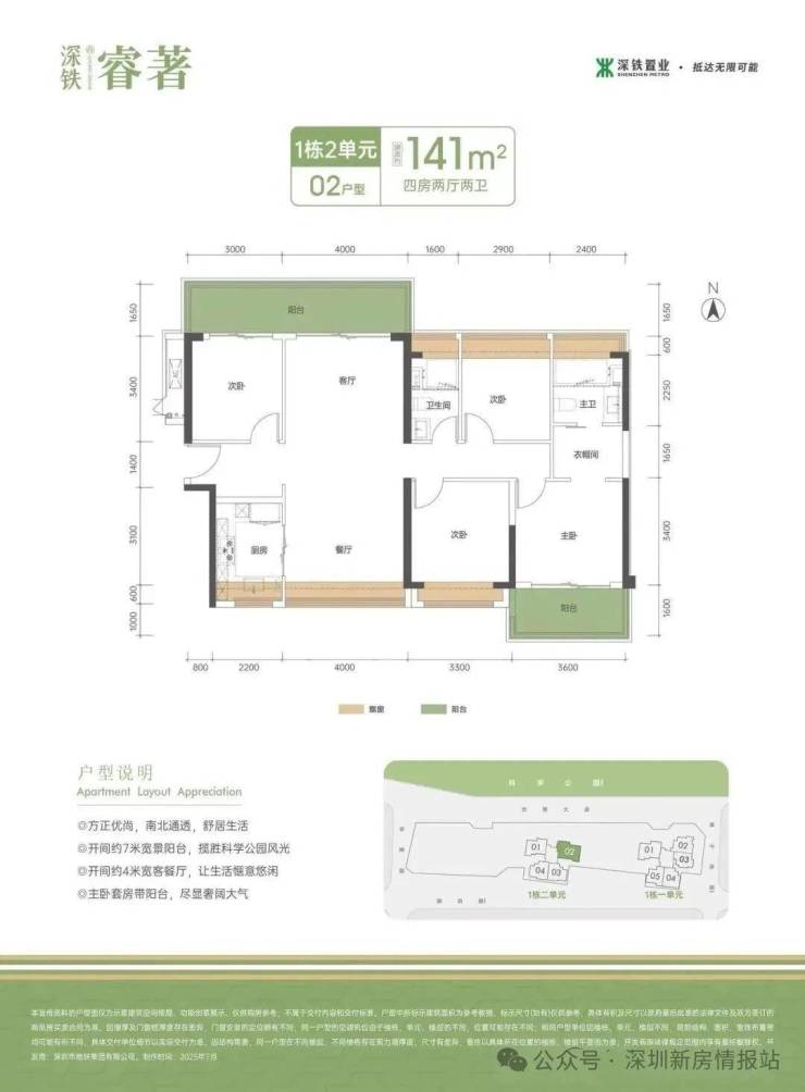 141㎡的4房2厅2卫,1栋2单元02户型,设计的是竖厅南北通透格局,进门入户玄关,客厅4米开间,实测高达31.58㎡方正餐客分离,餐厨一体设计,四开间朝南,主卧套房带阳台,4个卧室分别做到了主卧19.89㎡/次卧11.49㎡/次卧9.3㎡/次卧9.1㎡(实测面积,去掉墙体),客厅连接次卧出11.55㎡的巨幕大阳台,U型厨房,卫生间干湿分离,得房率约:80%(不含赠送),阳台主朝东北向看科学公园。套内面积112.8㎡+赠送面积18.5㎡=实用面积131.3㎡,加上赠送后得房率约93.12%。