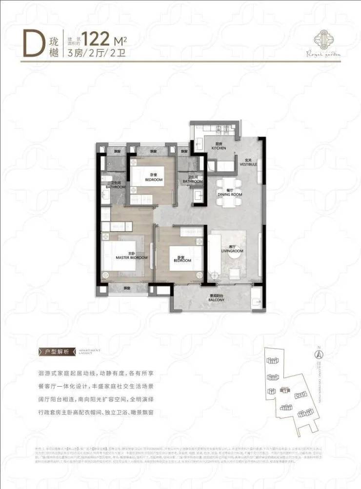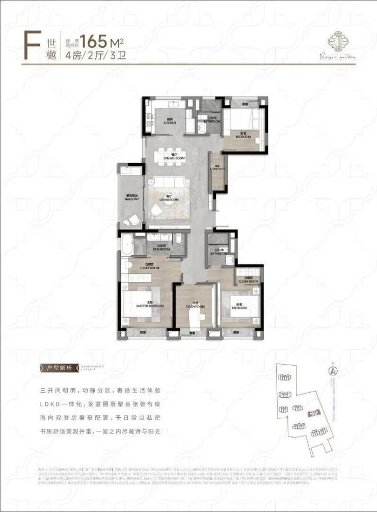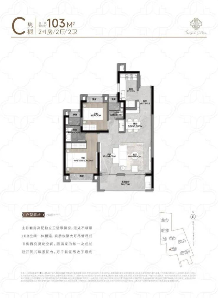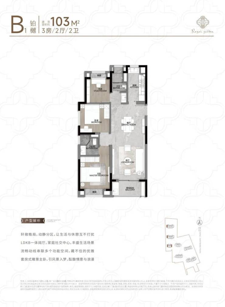 104㎡3户型特点:该户型多为楼栋的东边套,是一个观景户型。客厅连接270°阳台,视野出众。双卧朝南,阳光满溢。从次卫布局看,如果家庭人口较少,该户型还能做成双套卧。