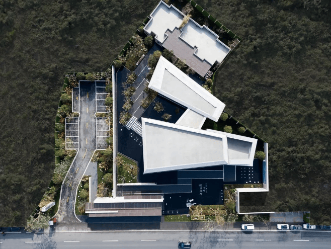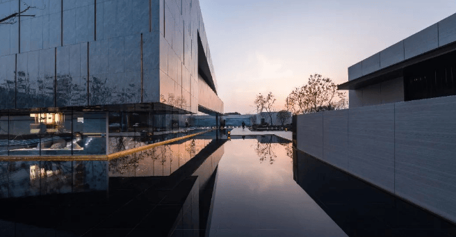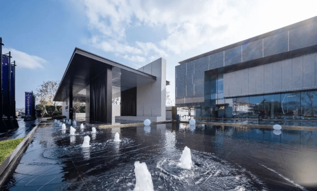 建筑设计:采用新亚洲建筑风格,以明快的浅米色及深咖色为主色调,运用高透玻璃、真石漆等材质,通过轴线对称、三段式构图等手法,营造出具有仪式感与生命力的建筑外观。