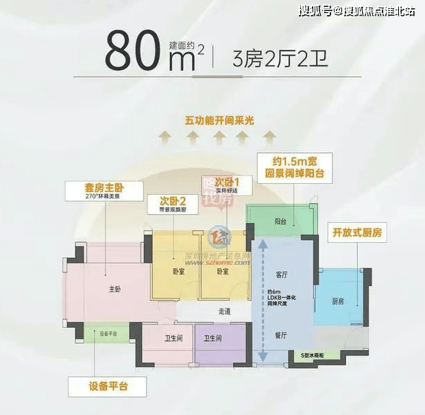 80㎡的 3 房 2 厅 2 卫:竖厅南北通透格局,客厅 3.2 米开间,全屋 9 个飘窗面,主卧 18.38㎡,次卧 7.32㎡、7.16㎡,得房率约 104%,阳台主朝西北或东北向。