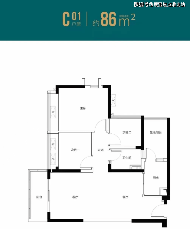 约 86㎡三房两厅一卫:竖厅格局,客厅 3.6 米开间,动静分区,三开间朝南,L 型厨房,带生活阳台,阳台西南朝向。
