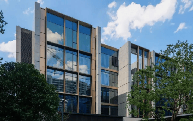 建筑设计:由 GAD 设计集团总建筑师张微主笔,外立面采用新疆紫罗兰高档石材干挂 + 隐框玻璃幕墙,局部点缀飞檐窗框。