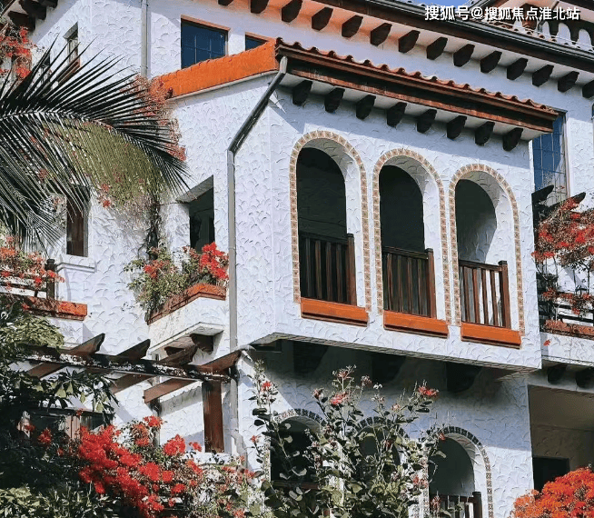 建筑风格:整体为西班牙 “安达卢西亚” 风格,外立面采用当地石灰烧制,白墙红瓦,红陶筒瓦、手工涂抹墙、弧形墙、一步阳台、铁艺、陶艺挂件等元素的运用,使建筑与蓝天大海浑然一体。由一栋主楼和十栋单体建筑围合形成 W 形状,围合成的西班牙庭院中心区域为休闲娱乐广场。