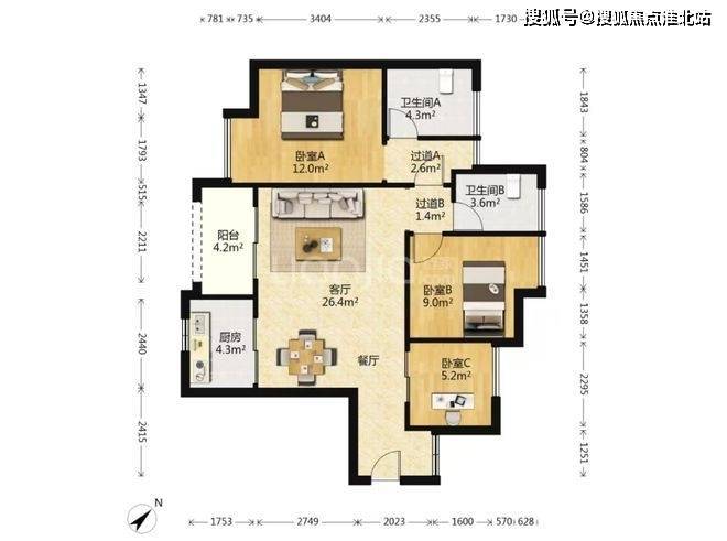 户型图暂缺。估计89平米的两房会有比较大面积的搭板情况。但是,你可以参考一期已经销售的89平米三房两厅两卫。预估这两批产品相似度极高。