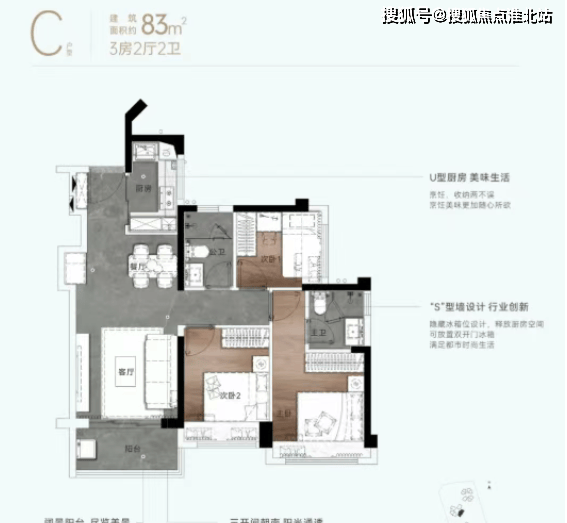83㎡的 3 房 2 厅 2 卫:经典竖厅格局,客厅 3.3 米开间,入户预留 S 型冰箱位,三开间朝南,U 型厨房,得房率 80.4%,客厅阳台全部东南朝向。