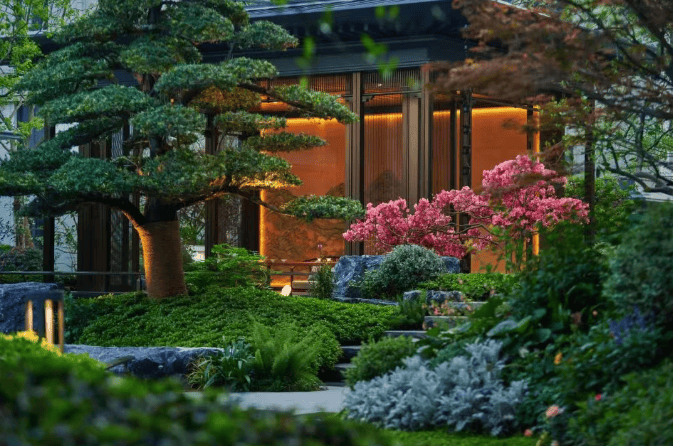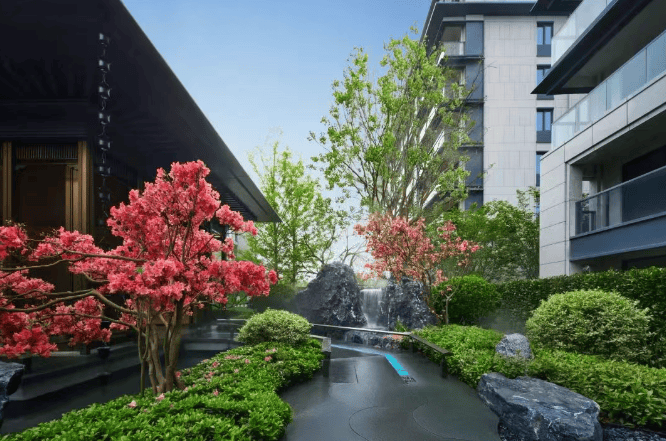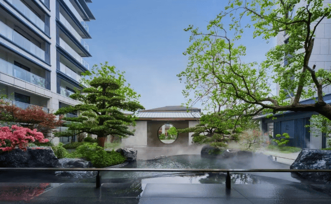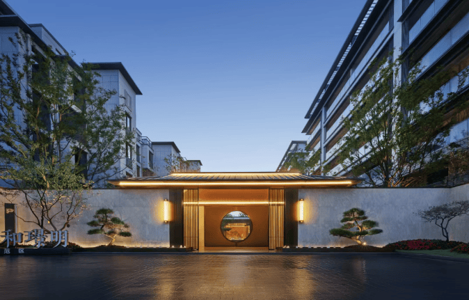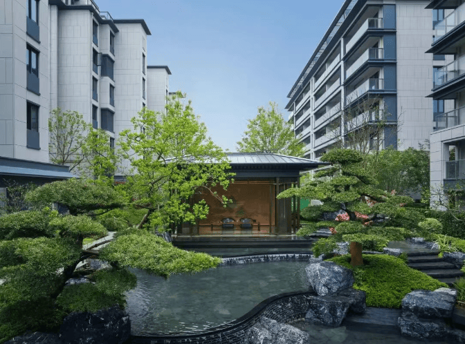 园林设计借鉴苏州园林曲径连廊设计,打造两轴三园七居景观。有南北景观轴、东西归家轴,宴饮园、享乐园、舒怡园三大功能空间,以及七进式礼序归家动线,包括铝板雨棚、星空顶入户大堂等。
