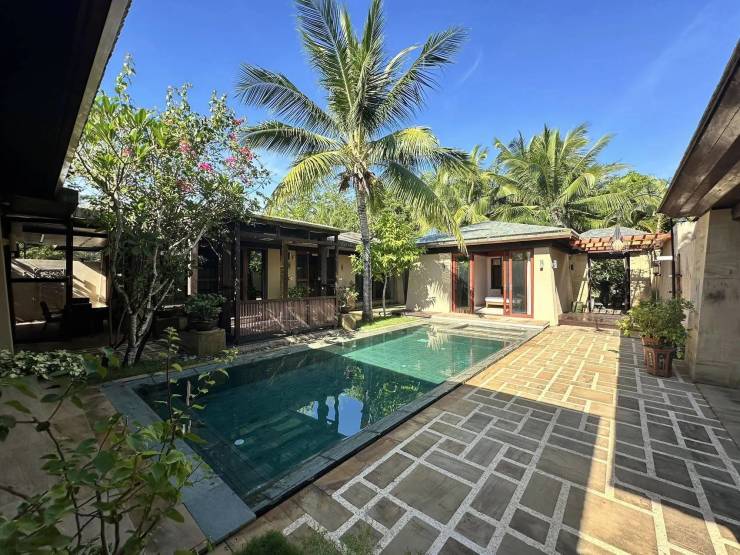 建筑风格:融合中国商周 / 战国文化元素,采用海南火山岩等本土耐候材料;单层为主,户户通透,保证观海面与庭院私密性;园林为 40 万㎡热带生态园林,水系与植被交错。