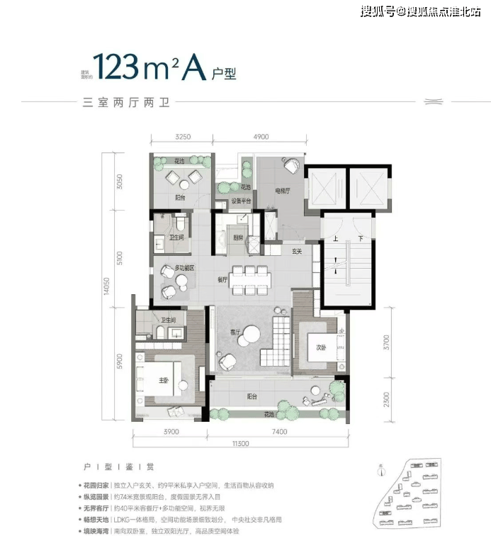 客餐厅:面积约 40 平方米,次卧以推拉式落地窗与阳台相连,约 7.4 米面宽的南向景观阳台,可尽享清风与暖阳。