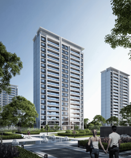 建筑设计:采用中西合璧建筑风格,外立面运用仿石材一体板和铝板线条,整体美观大气。项目共 7 栋楼,由 5 栋 18F 小高层和 2 栋 23F 高层组成,全部为首层架空,打造微度假式风格社区。