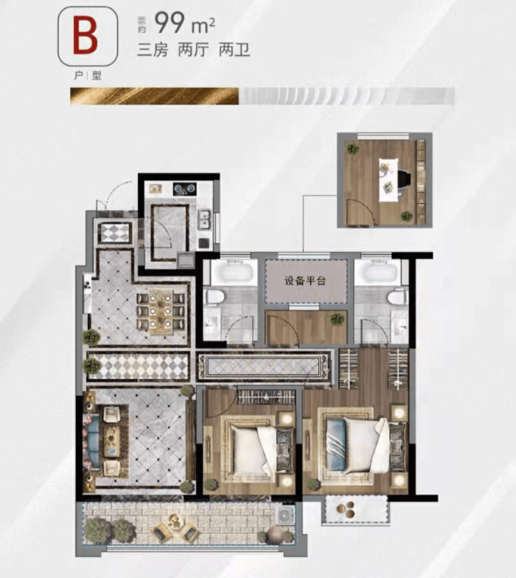 99㎡3房2厅2卫:项目99㎡是一个非常优秀的小3房设计,虽然建面不超过100㎡,但依旧是两个卫生间的设计,最大程度的保证了居家舒适度。